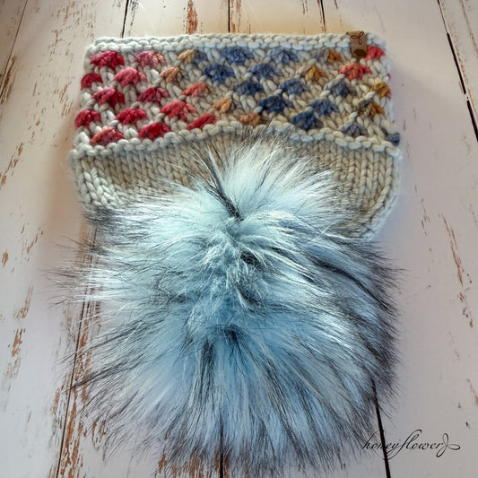 Lotus Flower brim hat with pom | glacial blue & coral | 100% merino wool
