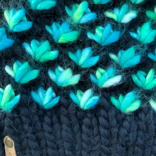 Lotus Flower beanie with pom | black and teal | 100% merino wool